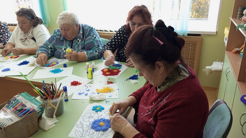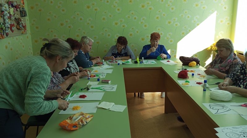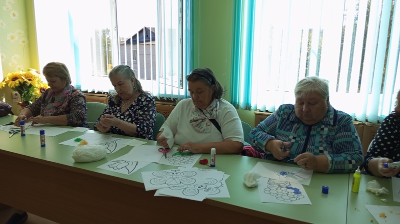 В отделении дневного пребывания ГБУ КЦСОН Краснобаковского муниципального округа специалисты Краснобаковской библиотеки провели мастер – класс «Аппликация из мелко нарезанных шерстяных нитей».